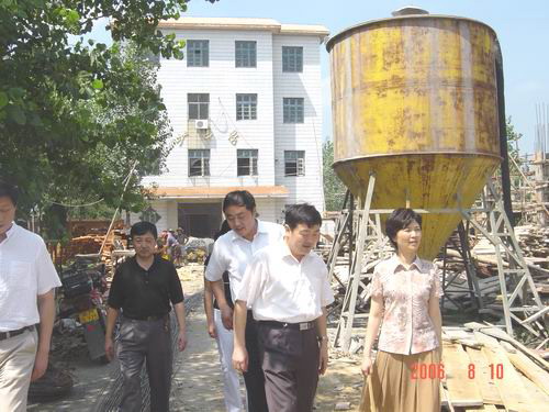 图为徐成银场长陪同周副市长一行在大圹学校,察看了解由台商捐资正在兴建的“明德工程”教学楼施工情况。