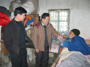 2004年元月6日,省农垦集团公司党委书记丁俊先来 到寿西湖农场,慰问今年遭受特大洪涝灾害的寿西 湖农场全体职工。丁俊先来到特困职工家中,送去 慰问金和米、面,鼓励受灾职工振奋精神,度过难 关。