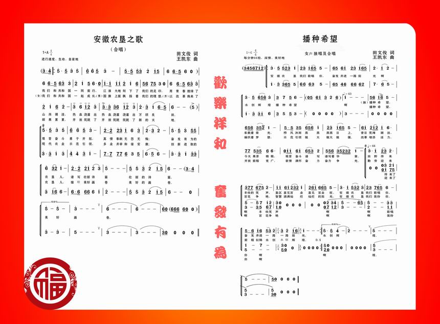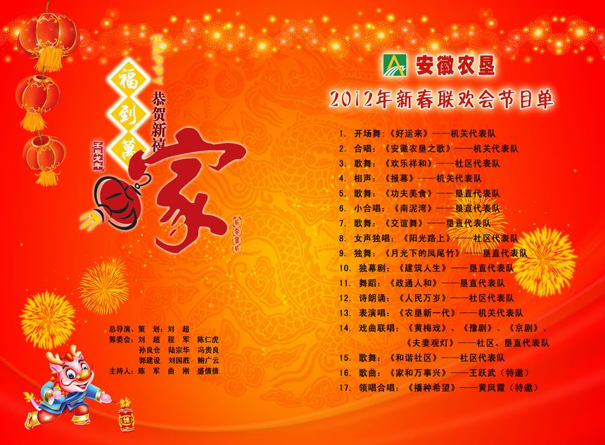 联欢会在一曲欢快的《好运来》歌舞中拉开帷幕,随后,集团公司领导班子全体成员及部分处室负责人在作曲家王凯东先生的指挥下演唱了为农垦创作的《安徽农垦之歌》,热烈奔放,慷慨激昂,表达了13万农垦人奋发向上的心声。机关、垦直和社区三个代表队分别为联欢会呈现上精彩纷呈的节目,体现了本次联欢会“欢乐祥和,奋发向上”的主题。相声《报幕》为联欢会带来了阵阵笑声。歌曲《阳光路上》讴歌了农垦人的幸福生活。诗朗诵《人民万岁》激昂顿挫,表达了对第一代共和国领袖的敬仰。表演唱《农垦新一代》展示了农垦新生代的青春风采。戏曲联唱唱出了中华传统文化的精髓。联欢会特邀安徽省歌舞团团长王跃武先生深情演唱了《家和万事兴》和《左邻右舍》,精彩的演唱赢得了阵阵掌声。安徽省著名歌唱家黄凤霞领唱的《播种希望》展现了农垦奋发有为、充满希望的广阔前景,声情并茂的演唱将联欢会推向了高潮。