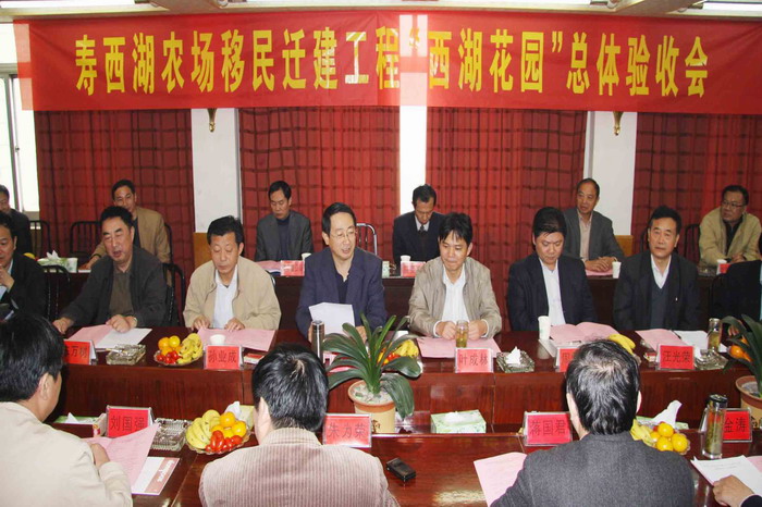 专家验收组及与会领导、代表首先查看了西湖花园住宅小区、老房拆迁点现场及各类档案资料,走访了部分迁移户。在随后召开的验收总结会上,寿西湖农场场长朱为荣致欢迎辞,副场长蒋国君作了移民迁建工作总结汇报。随后,专家验收组成员观看了项目实施专题片,听取了工程勘察、设计、施工、监理、质检等单位和职工代表的发言,专家们对工程逐一作了综合评价,均表示同意该工程通过总体验收。