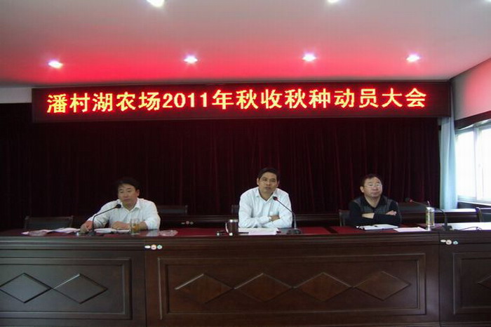 9月27日,潘村湖农场率先召开2011年秋收秋种动员大会。会议指出,秋收秋种工作中,全场上下要以科学发展观和中央一号文件精神为指导,以实现职工增收和农场增效为要务,以提高种业市场竞争力为发展重点,继续实施农场《小麦万亩千斤高产攻关活动方案》,巩固攻关成果,稳定千斤亩产,实现新的高产突破,当好区域农业发展排头兵。会议强调,一要充分认识在地作物长势良好的成果来之不易,克服了今夏不到两个月里潘村湖地区降水近千毫米,农场汛期排涝及时、后期田管到位,才打下了丰产基础;二要立足“早、抢、好”三字方针,成熟一块抢收一块,确保颗粒归仓;三要加强领导,做好预案,靠前指挥,紧张有序,安全生产,农技人员要加强对深松深耕、种子包衣、配方施肥等工作的技术指导;四要抓好农产品上交工作,确保种子生产数量和质量,确保全年目标任务的圆满完成;五要结合结构调整搞好土地调整工作,落实好牛蒡、水稻等高效作物新增种植面积的土地调整和区域安排,并发挥好职工的主体作用,推动高效农业发展。