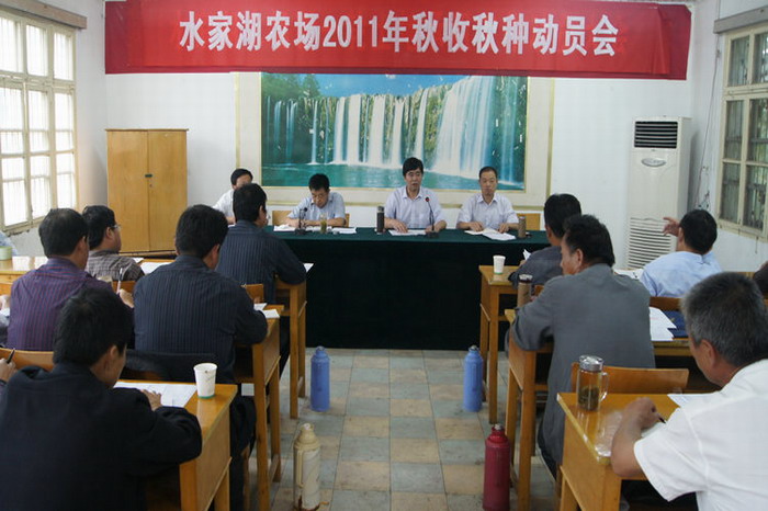 9月28日,水家湖、寿西湖等场召开动员大会。水家湖农场较之去年,今年大豆种植面积缩小,水旱稻、芝麻种植面积扩大,降雨量偏多、日照偏少、气温偏低是今年秋季作物生育期的主要天气特征。为此,今年秋收秋种工作的特点是,收获期延长,安全保卫任务重;深松整地对土壤墒情要求标准高,整地播种时机要因墒制宜;播后旱情可能发展,要做好抗旱的准备。会议要求,一要积极与地方相关部门对接联系,切实做好安全生产保卫工作;二要从秸秆还田、种子包衣、改进深松、稻茬麦种植等方面落实好关键技术措施,确立“适应型农业”的思想,做好秋种抗旱立苗的准备;三要正确处理好秋收秋种与新一轮土地承租、保障房建设、综治维稳、国庆长假等工作的关系,各级管理人员要确保24小时开机,严禁酗酒和疲劳作业;四要落实工作措施,对工作任务和措施作一个详细的量排,强化各项服务措施与落实,强化各项纪律遵守与执行。