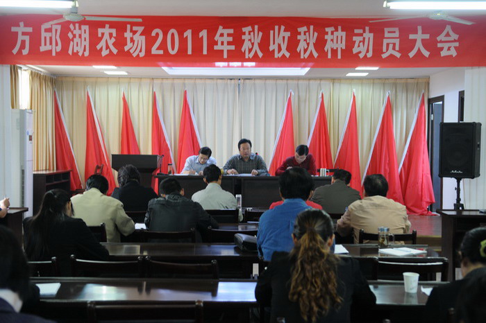 9月29日,方邱湖、东风湖、夹沟等场召开动员大会。方邱湖农场要求秋收秋种工作要抓好六件事:一是注重安全生产特别要注意农机作业安全,把安全生产与绩效考核相结合;二是结合秋种抓好结构调整,发展高效种植;三是抓好秸秆还田和测土配方施肥工作;四是抓好秋种品种布局,统一供种、统一耕作;五是把秋收秋种与“三十佳”劳动竞赛相结合;六是做好抗旱准备,适时抢墒立苗。东风湖农场要求以发展高效农业、种子产业为主线,以大豆确保丰收、小麦再夺高产、种业力促强势为总体目标,加大科技投入和良种良法推广,在大豆秸秆还田、小麦播量降低、麦田基肥投入量增加、深松鼠道等关键增产技术应用方面有所突破。夹沟农场要求以高产攻关为抓手,抓重点促产量,抓质量促进度,全力以赴夺取秋收秋种工作全面胜利。