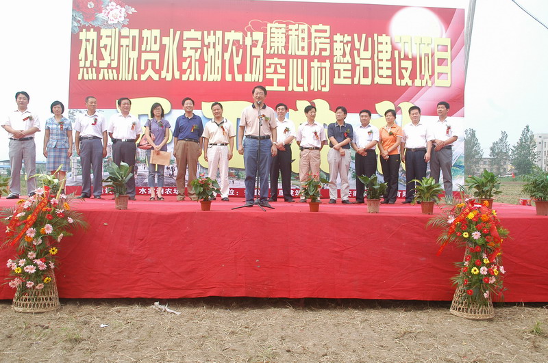 场长朱为荣在致辞中表态,农场将举全场之力,精心组织,多方协调,加强监管,攻坚克难,确保项目实施顺利推进,打造人民满意、领导放心、社会认可的精品工程;建设方代表刘会满在致辞中对工程质量、建设工期、安全生产进行了郑重承诺;集团公司副总经理刘超对水家湖农场抢抓机遇、迅速启动、在沿淮农场打响廉租住房建设第一枪致以热烈祝贺,要求水家湖农场认真建立并严格落实工程质量管理责任制,以一流的工作作风、强烈的工作事业心和高度的政治责任感,全力以赴,加快进度,保证质量,接受监督,把廉租住房建设好。