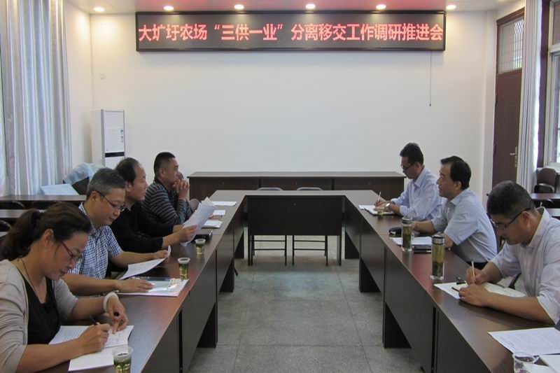调研推进会上,杨朝幸向吴汉金一行汇报了农场三供一业基本情况、分离移交存在的主要问题及下一步工作设想。宾主双方就此展开了深入交流探讨。