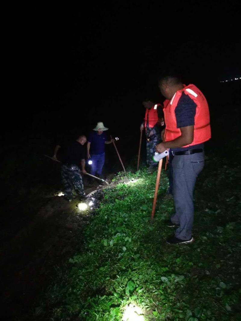 天已经完全黑下来了,堤坝上灯影摇曳,红旗猎猎。20名队员迎着夹带着原野芬芳的晚风,一手拿着木棍或锹锨,一手拿着高光手电筒,在长200米,宽约50米的范围内一字排开,“地毯式”仔细排查管涌、渗漏、塌方等堤防隐患。