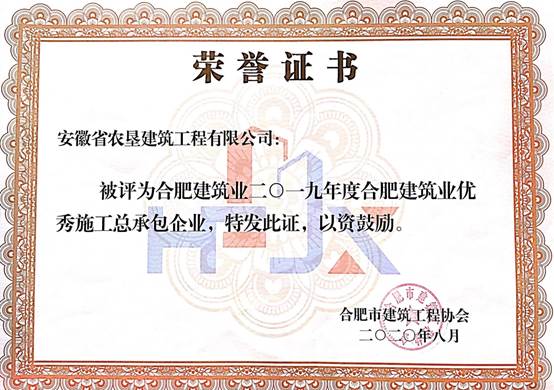 近日,合肥建筑业2019年度评优评先及2019-2020年度合肥市建筑工程“琥珀杯”奖(市优质工程)评审工作已全面完成,农垦建筑公司在此次表彰中喜获“合肥建筑业2019年度优秀施工总承包企业”。 这是公司连续第7年获得“合肥优秀施工总承包企业”称号。同时,在此次评选中,垦建下属的聚进劳务公司也连续第三年“合肥建筑业2019年度优秀施工劳务企业”称号。