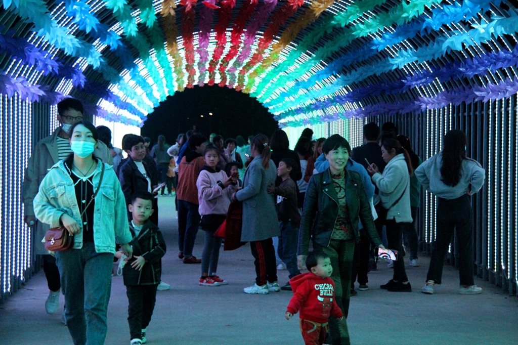 国庆中秋假日期间,升级改造后的龙亢农场农垦特色小镇景区向游人免费开放,每晚各式灯盏如约闪亮,灯光璀璨,景区内游人如织,络绎不绝,灯光秀点燃了万千游客的激情,景区内最高峰客流量超过3万人。
