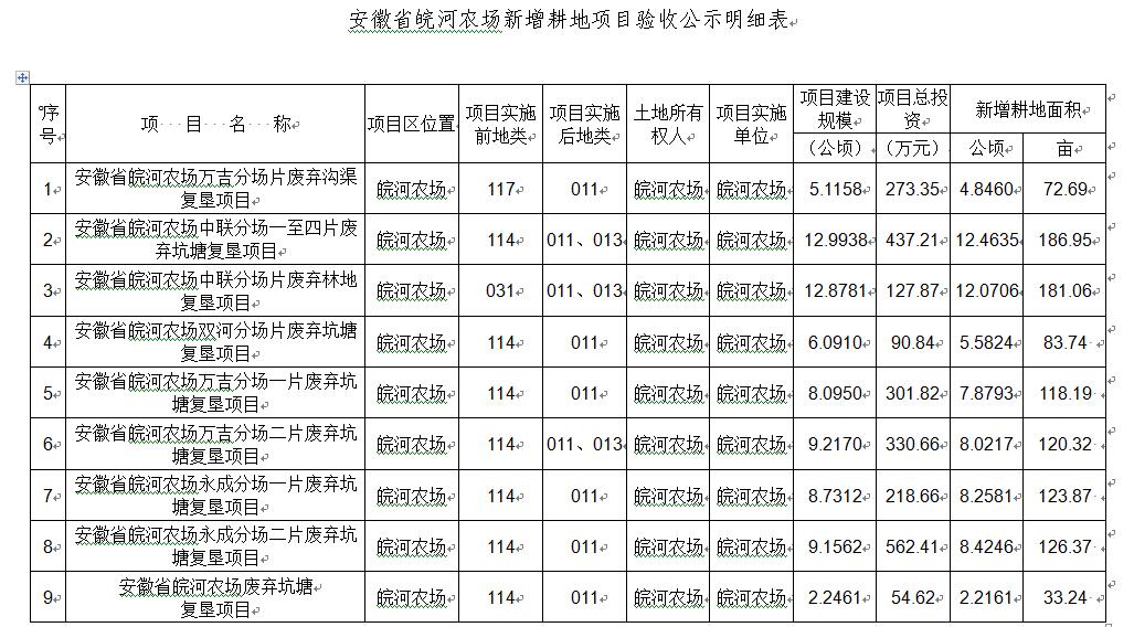 见《安徽省皖河农场2020年新增耕地项目验收公示明细表》