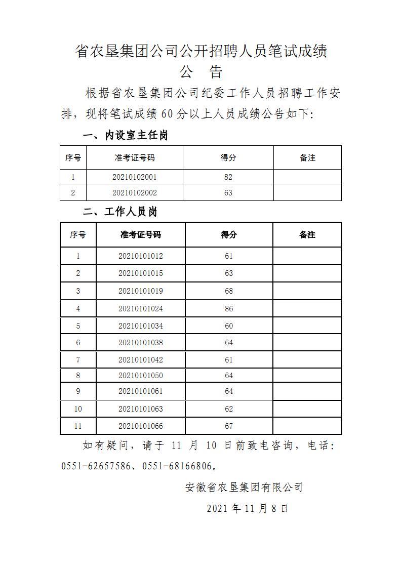 安徽农垦集团:省农垦集团公司公开招聘人员成绩公告