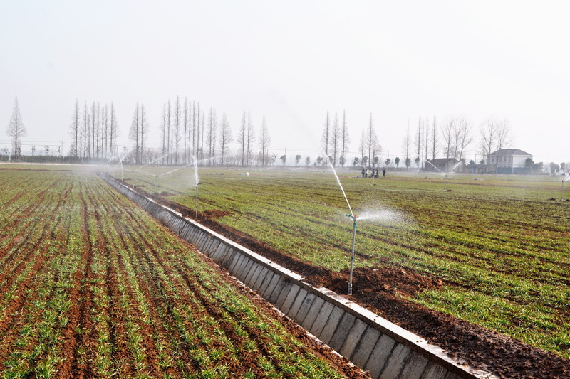 19,安徽农垦潘村湖农场小麦良种繁育田的自动喷灌系统正在进行浇水作业。针对近期持续少雨天气,农场按照小麦高产栽培技术规程要求,及时对出现旱情的田块进行节水灌溉,确保3万余亩在地小麦苗齐苗壮、安全越冬。(安徽日报201511002版,杨登宏摄)