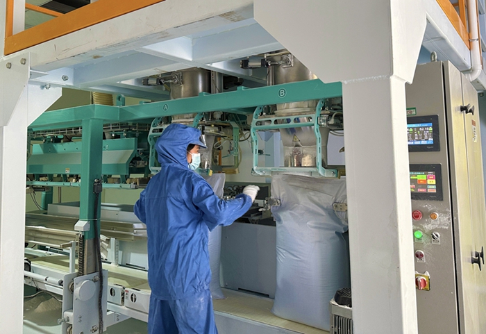 雪里香食品科技公司一名生产工人将刚加工出的糯米粉包装入袋。(朱丽烨 摄)