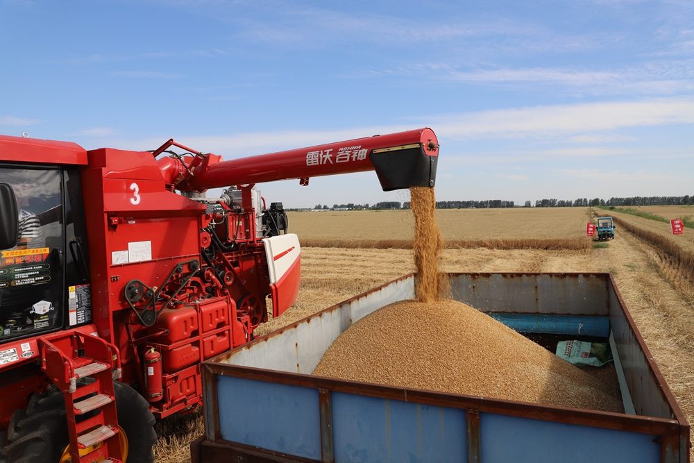 6月3日,潘村湖农场公司麦地里,200多台收割、运输和秸秆打捆离田机械穿梭驰骋,当天晚间,3万亩小收获过半。在第二农业分公司1号地,三台崭新的雷沃谷神大马力联合收割机正在展开局部机收会战,分公司农技人员不时走进大田检查机收质量。农场公司午收夏种指挥部综合办公室主任陈万军介绍道,“今年投入麦收的收割机普遍是新机型,机收损耗率全部符合规定标准,像这种雷沃谷神JM100机型,机收损耗率只有0.2%,基本实现颗粒归仓。”