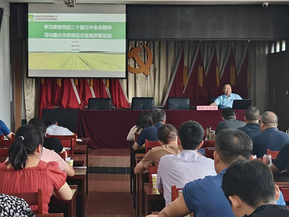 9月10日,农垦集团副总经理申玉恩赴淮南农场公司宣讲党的二十届三中全会精神并调研。农场公司党委主要负责同志主持宣讲报告会。集团公司审计法务部和垦健牧业负责同志,淮南农场公司领导班子成员,各部门单位副职以上管理人员、各党支部支委成员、支部党建辅导员、入党积极分子等共50余人参加了宣讲报告会