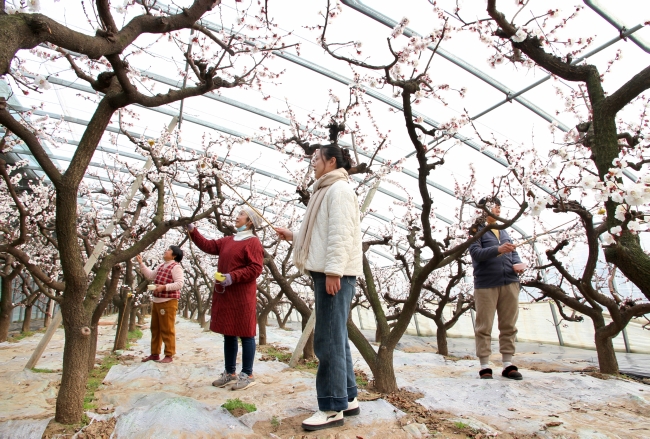 砀山果园场公司:大棚杏花开 果农授粉忙