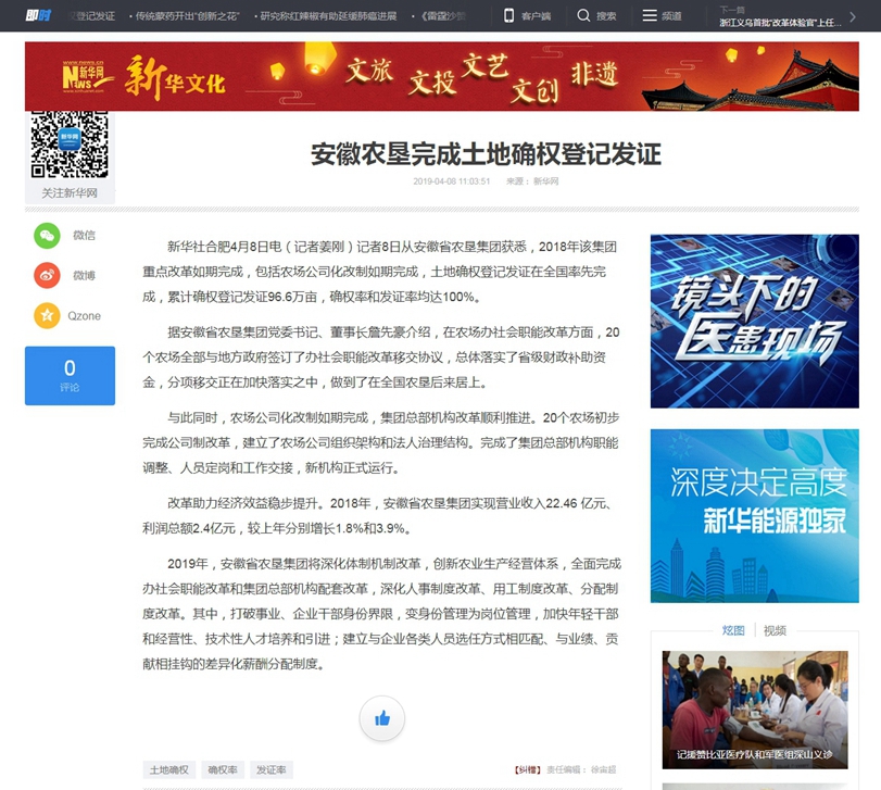 新华网4月8日报道《安徽农垦完成土地确权登记发证》,报道截图如下:
