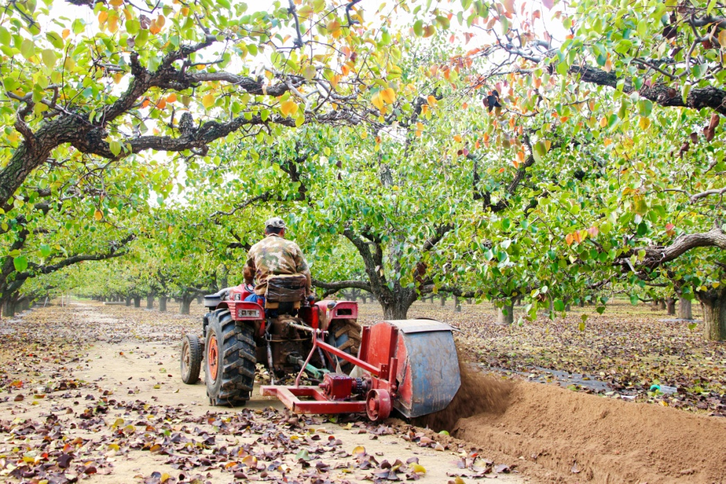 图为砀山果园场职工正在驾驶开沟机为梨树翻沟施肥
