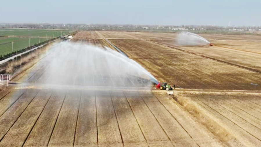东风湖农场紧急启动全面喷灌抗旱作业。一边组织4台挖掘机清理沟渠、疏通水路、调度水源;一边投入14台套大型喷灌机械每天15小时轮班作业,为小麦生长打牢基础。(高俊兵)