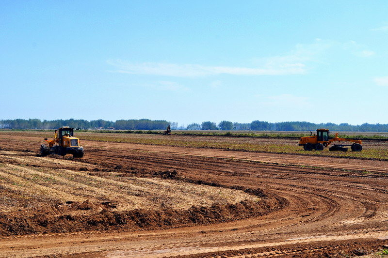 105,在安徽农垦潘村湖农场,大型工程机械正在进行耕地平整作业。土地整治项目完成后,全场3.2万亩耕地都将升级为地表平整、沟渠配套的高标准良田。(安徽日报2013109A2版,杨登宏摄)
