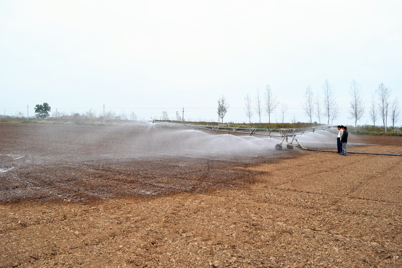 1024,安徽农垦潘村湖农场二分场的职工家庭农场正利用大型绞盘式喷灌机为麦田浇水。针对今年秋种以来出现的持续无雨天气,该农场的职工家庭农场利用各种灌溉设备为已播小麦的大田浇水,确保苗齐苗壮、安全越冬。(安徽日报20131026A2版,杨登宏摄)