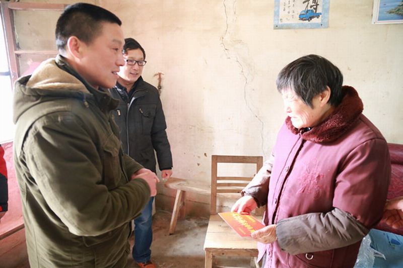 羊年春节将至,24日上午,广德县民政局党委委员刘可新率民政所管理办、救灾股负责人到祠山岗茶场慰问送温暖,走访基层下队串户、访贫问苦,把一份份慰问金送到特困职工手中,祝愿他们过上一个欢乐祥和的新春佳节。特困职工对党和政府的关怀表达了最真诚的感谢。