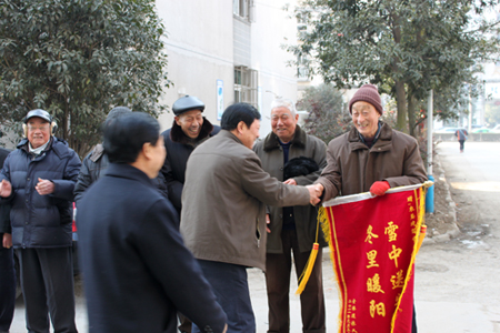 131上午,在一阵欢快的鞭炮声中,安徽垦建公司总经理孙道良、党委书记刘会满接过退休职工送来书写着雪中送炭,冬里暖阳的锦旗。