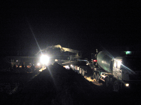 安徽农垦焦岗湖农场廉租住房夏丽花园工程在完成施工围墙、施工道路和定位放样及施工水电安装的基础上,于11月20日下午开始基槽开挖工作。截至12月5日,16栋房中已开挖13栋,其中完成10栋(有6栋具备基础浇筑条件)。经项目监理单位检验认可,地方城建质量、安全等监督部门审查合格后,基础浇筑工作于12月6日展开。经过施工、监理和业主夜以继日的辛勤努力,浇筑工作于8日上午完工。此次基础浇筑,除1栋楼房采用自拌混凝土外,其余5栋楼房全部采用商砼。采用自拌混凝土的能够严格按照实验室提供的配合比进行操作,完全符合质量要求。