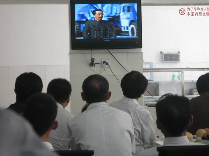 10月1日上午十点,在皖河农场沿河医院新落成的住院部大楼一楼大厅里,座无虚席,人头攒动,当地不少群众自发聚集到这里,集体收看央视正在直播的国庆大阅兵盛况。
