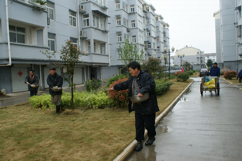 44,在清明节小长假之际,大圹圩农场东方物业公司全体员工冒着绵绵春雨,正在东方花园职工小区绿化园里撒施肥料,忙着辛勤护理花草树木。