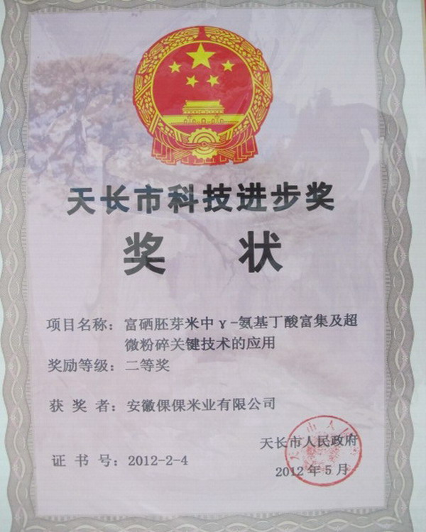 此次获得天长市科技进步奖的企业共21家,其中,一等奖三个,二等奖8个,三等奖10个,涉农企业仅占4个。倮倮米业科技项目富硒胚芽米中γ-氨基丁酸富集及超微粉碎关键技术应用荣获二等奖,滁州市委常委、天长市委书记杨东坡为倮倮米业颁发了获奖证书,勉励公司再创佳绩。(赵家平)