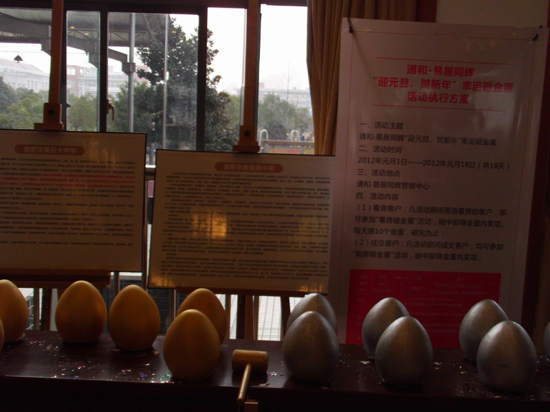 2012年元旦佳节期间,安徽农垦通和房地产集团合肥公司举办了通和·易居同辉项目系列促销活动。活动针对看房客户、成交客户设置了两类幸运砸金蛋:首次看房并登记信息的客户可通过槌砸金蛋获得奖品;购房成交客户则可通过槌砸金蛋获得现金奖励冲抵房款。此外,该公司还利用节假日主动“走出去”,到合肥市主要社区和商业繁华地段派发项目推介广告单页。