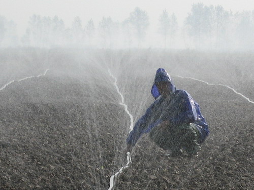 安徽农垦充分发挥国有农场组织化程度高的优势,大力推广先进适用的节水灌溉技术,使垦区85%的耕地实现了节水灌溉, 到目前,全系统每年节水达5000万立方,抗旱费用每年也节省了近千万元。图为潘村湖农场为了让已播种子顺利出苗,正在利用先进的微喷技术进行抗旱,微喷操作简便,投资少,效果如雾似雨,可以节省灌溉用水60%,同时由于灌溉效果好,能确保证小麦及时出苗和全苗,因此被职工们形象地称为“可以自己掌握的‘及时雨’”。(杨登宏 摄)