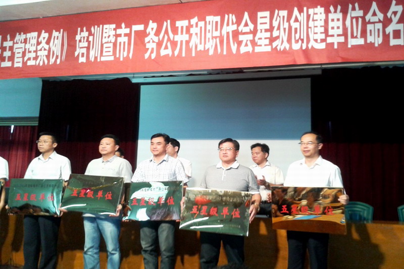 近年来,皖垦食品集团工会有组织、有计划、有步骤地推进场务公开民主管理工作,成立领导小组,制定实施方案,明确目标任务,各项工作举措落实到位。今年继荣获蚌埠市2013年度厂务公开民主管理先进单位之后,日前,又被市总工会授予“2013-2014年度全市厂务公开和职代会五星级单位荣誉称号。(李峰)