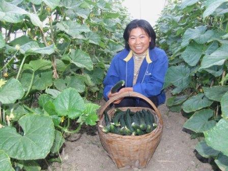 龙亢镇钱皇村农民汤敏面对喜获丰收的黄瓜会心地笑了,她在龙亢农场农科所承包了近2亩蔬菜大棚,在农场农业技术人员的悉心指导和自己的辛勤劳作下,种植的名优无公害黄瓜现已上市,据她介绍,每亩黄瓜收益将超过12000元,与当地常规种植的黄瓜相比,每亩增收2000-3000元。