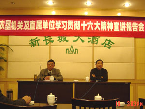 12月8 日下午,安徽省农垦集团公司在新长城大酒店举 办“安徽农垦机关及在肥企业学习贯彻十六大精神宣讲 报告会”。集团公司领导丁俊先、李卓民、刘超,集团 公司机关全体干部、农垦在肥企业:黄山大厦、新长城 大酒店、万源种子公司、农垦建筑公司、农垦供销公 司、兴科农机公司、农垦经贸中心、长城物业公司等单 位中层以上的干部120多人参加了报告会。省宣讲团成 员方文华联系安徽省及安徽农垦改革开放和经济发展的 实际,就党的十六大召开的重大历史意义和现实意义做 了宣讲报告,引起了与会者的强烈反映,受到了广大干 部群众的热烈欢迎。