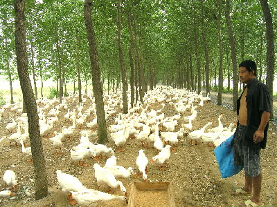 今年38岁的田益成是安徽省潘村湖农场第二管理区职工,他在种好承包田的同时,积极发展养殖业。今年,该户家庭农场可出栏优质大白鹅1万只,预计获利15万元。图为田益成正在饲鹅的情景。(杨登宏)