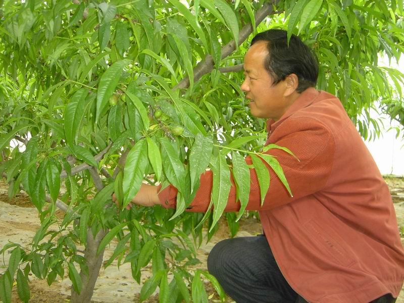 大棚内,一分场技术员孟凡富正在指导职工管理大棚水果的技术,孟凡富是砀山果园场一分场设施大棚园建设的带头人,是高效农业的实践者,也是推动者。自2003年以来,他带领一分场部分职工发展大棚杏,通过积极地探索,大棚杏生产和管理取得了成功的经验,获得了显著的经济效益,并总结出一套完整的大棚生产和管理技术。设施大棚的发展关键要靠技术支撑,果园场高度重视,除建棚实行扶持政策外,还举办设施大棚栽培技术培训班,作为分场技术员的孟凡富负责现场指导。由于技术传授给职工,设施大棚技术培训到园,技术难题解决在园内,广大职工管理大棚水果得心应手,大棚的罩棚、放风、卷毡及果树的授粉、施肥、修剪、植保等一系列生产管理措施都按部就班实施。天道酬勤,2010年,砀山果园场一分场18眼大棚水果坐果率高、果品质量好,据孟技术员介绍,今年每个棚预计比去年增产10—20%,为丰收打下了坚实的基础。