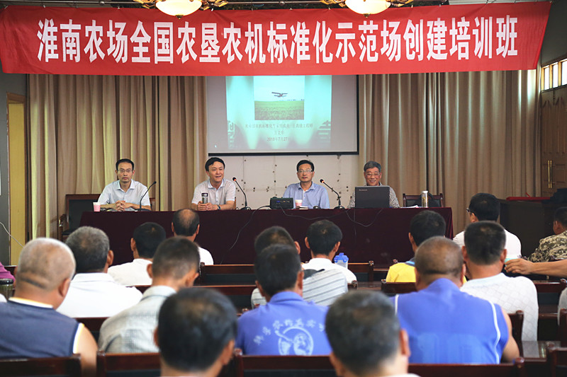 727,淮南农场举办全国农垦农机标准化示范场创建培训班,农业部入库专家方文华、省农垦集团农水部副总农艺师韩大鸣到场授课,场领导及各级农机管理人员、农机手、种粮大户共计70余人受训。