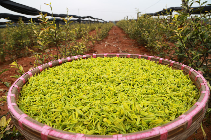 黄金芽属珍稀白化茶树种质资源品种,是我国培育成的唯一黄色变异茶种,一年可三季采制,即使在夏秋季节,品质也不逊于其他春茶。黄金芽三黄特点凸显,即干茶亮黄、汤色明黄、叶底纯黄,氨基酸含量高达9%,市场前景十分看好,有力助推了祠山岗茶叶高效化、产业化发展。(徐言东)