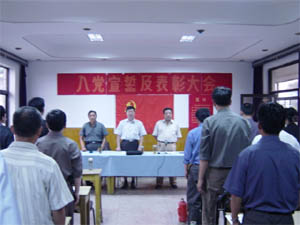 纪念大会在雄壮的《国际歌》声中开始。10名新入 党的同志面对鲜红的党旗高举右手庄严宣誓,立志 为共产主义事业奋斗终身。新、老党员代表梁国 海、孟凡东满怀激情,分别在会上发了言。会议还 对在过去一年中为农场两个文明建设做出突出贡献 以及在抗击“非典”战斗中表现突出的3个先进党支 部、6个先进党小组、18名优秀共产党员和13名优秀 党务工作者给予了通报表彰。
