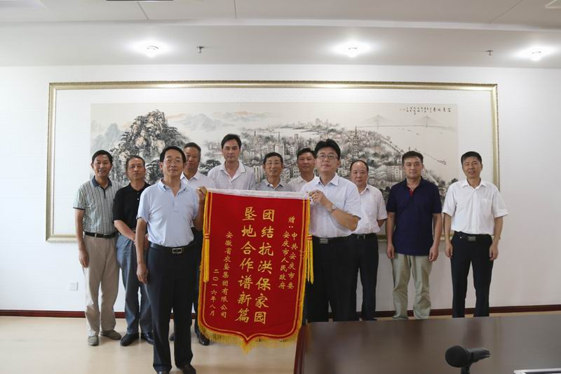 刘超代表安徽农垦集团向安庆市委市政府赠送了“团结抗洪保家园,垦地合作谱新篇”的锦旗。安庆市政府副秘书长许晓峰及市民政、农委、水利等部门和农垦集团办公室、农水科技部、华阳河农场、皖河农场负责同志参加了上述活动。