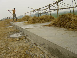 列入我省“通达工程”项目的“天湖公路”(自天 长市至原湖滨乡,途经大圹圩农场),施工人员正 冒着高温抓紧施工,有望在明年上半年全线贯通。 图为施工人员对新浇筑的水泥路面进行保养。(杨 朝幸)