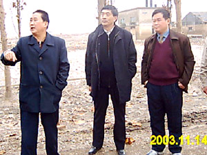 11月14日,中国农林水总工会丁主席等一行2人在省 农垦集团公司副总经理刘永火和工会主任李安寿两 位同志陪同下专程前往我场检查灾情,并深入一、 二分场实地考察受灾现场,对我场抗灾自救和恢复 重建工作提出指导性建议。图为丁主席(中间)深 入受灾现场失地察看灾情。(焦岗湖农场)