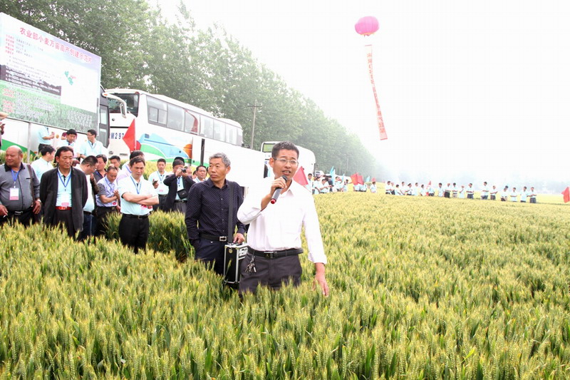 5月18日,黄淮地区各省市县农业科研院校的小麦专家、农业部门负责人、种子经销商、种植大户等360余人云集安徽农垦龙亢农场,现场观摩小麦良种生产。副场长王永玖向各地来宾介绍了农场小麦新品种特性和高产栽培技术模式。(李峰)