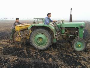 图片说明:6月14日上午开始,潘村湖农场广大职工 家庭农场冒雨采取耙茬免耕、机播、耩播相结合的 办法抢墒播种夏大豆,到当天下午6时已播种近2万 亩,预计到15日下午可望提前完成今年夏种任务。
