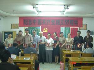 七月一日上午,水家湖农场召开建党83周年纪念 会,陈仁虎书记作了题为《我是党员,就是要有党 员的榜样》的演讲。会议除举行新党员入党宣誓、 表彰先进、观看录相教育等活动外,与会人员还再 一次庄重地举起拳头,重温了入党誓词。