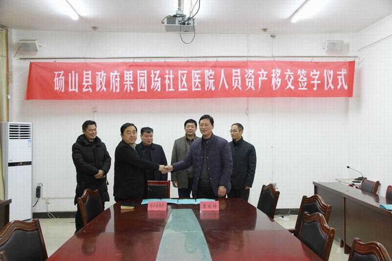 1217,砀山县政府果园场社区医院人员资产移交签字仪式顺利举行,场长叶华富、副县长陈新启分别在协议书上签字,根据协议,医院人员按现状全部由砀山县接收,继续保留原果园场医院牌子,自201911起纳入政府预算管理。同时,叶华富、玄庙镇党委书记毛立勇签订了果园场《社区人员资产移交协议书》《三供一业(物业、供水)人员资产移交协议书》,根据协议,自201911,社区人员经费纳入地方财政预算管理,各项社会管理职能、三供一业管理服务全部移交地方。