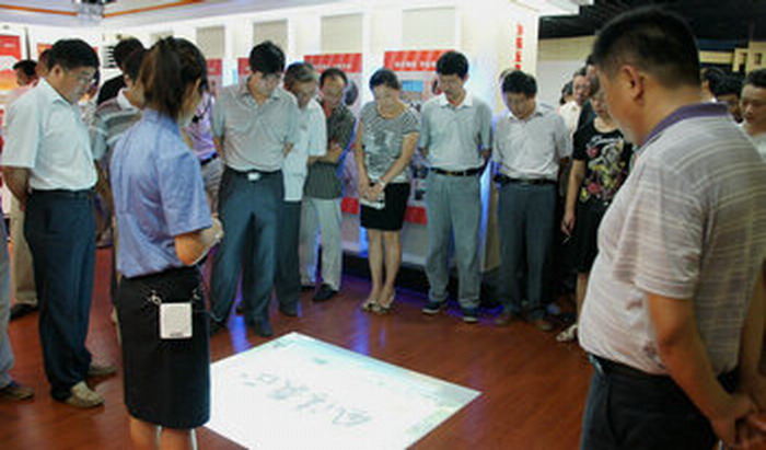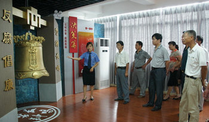 室内展厅分为决策篇、预防篇和警示篇。从党和国家领导人提出的“两个务必”到“反腐败要同党的纯洁性教育结合起来,对于违法违纪行为要依法查处,绝不姑息”,体现了中国高层决策上对反腐倡廉工作的高度重视和坚定决心。展示墙上悬挂着《中国共产党廉洁从政准则》等法律法规,以及古人廉洁为官的典型事迹,其中,东汉太尉杨震“天知”、“神知”、“我知”、“子知”的典源,彰显了为官者的原则、道德与良知。警示篇中,一幅幅警示图片和一个个真实案例,形象生动地阐释了十种新形式受贿案例,以及近年来各级官员因贪污受贿而身陷囹圄的重大案件,再现了那些曾经位高权重的高官和所谓的“人民公仆”是如何被金钱美色冲昏头脑、最终沦为阶下囚的真实过程,触动着在场每个人的心灵。通过复原服刑人员家属探监的场景,让全体党员干部感受到了家庭责任和腐败危害。警示展览资料与艺术品创作、多媒体演绎、声光电等现代展陈手段相配合,生动形象、图文并茂,展示了职务犯罪的严重危害,震撼了全体党员干部的心灵。
