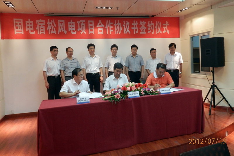 719上午,安徽农垦华阳河农场、宿松县人民政府与中国国电集团安徽电力有限公司三方风电合作项目签约仪式在合肥举行。仪式由宿松县常务副县长梅耐雪主持,省农垦集团纪委书记储诚胜、国电安徽公司总经理史太平、宿松县县长王华、华阳河农场场长孙国安出席仪式。省农垦集团及华阳河农场、国电安徽公司、宿松县政协及发改委相关负责人参加了签约活动。