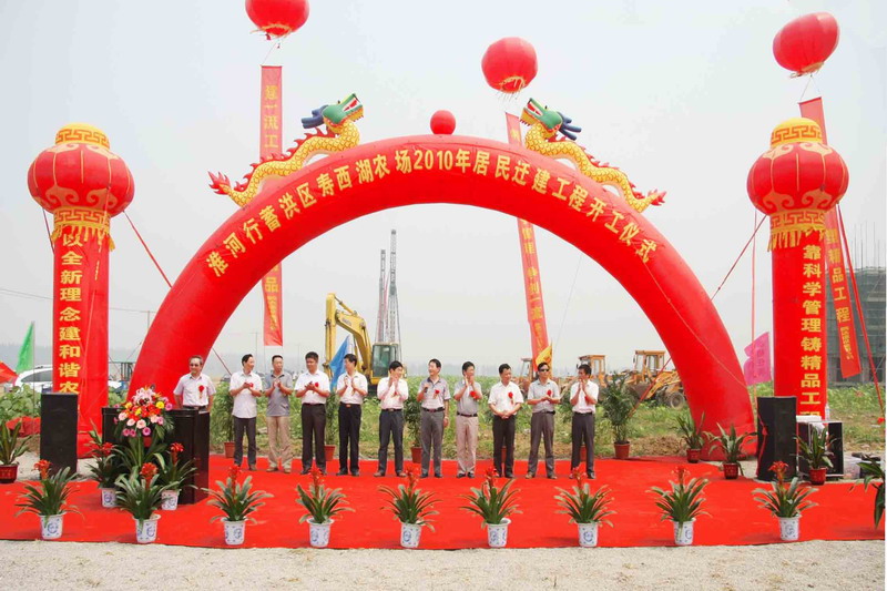 651018分,安徽农垦寿西湖农场隆重举行淮河行蓄洪区2010年居民迁建工程开工仪式。省农垦集团副总经理刘超及集团相关部室、寿西湖农场负责同志,寿县副县长程明及住建局、水务局负责人,施工监理单位代表参加了典礼活动。